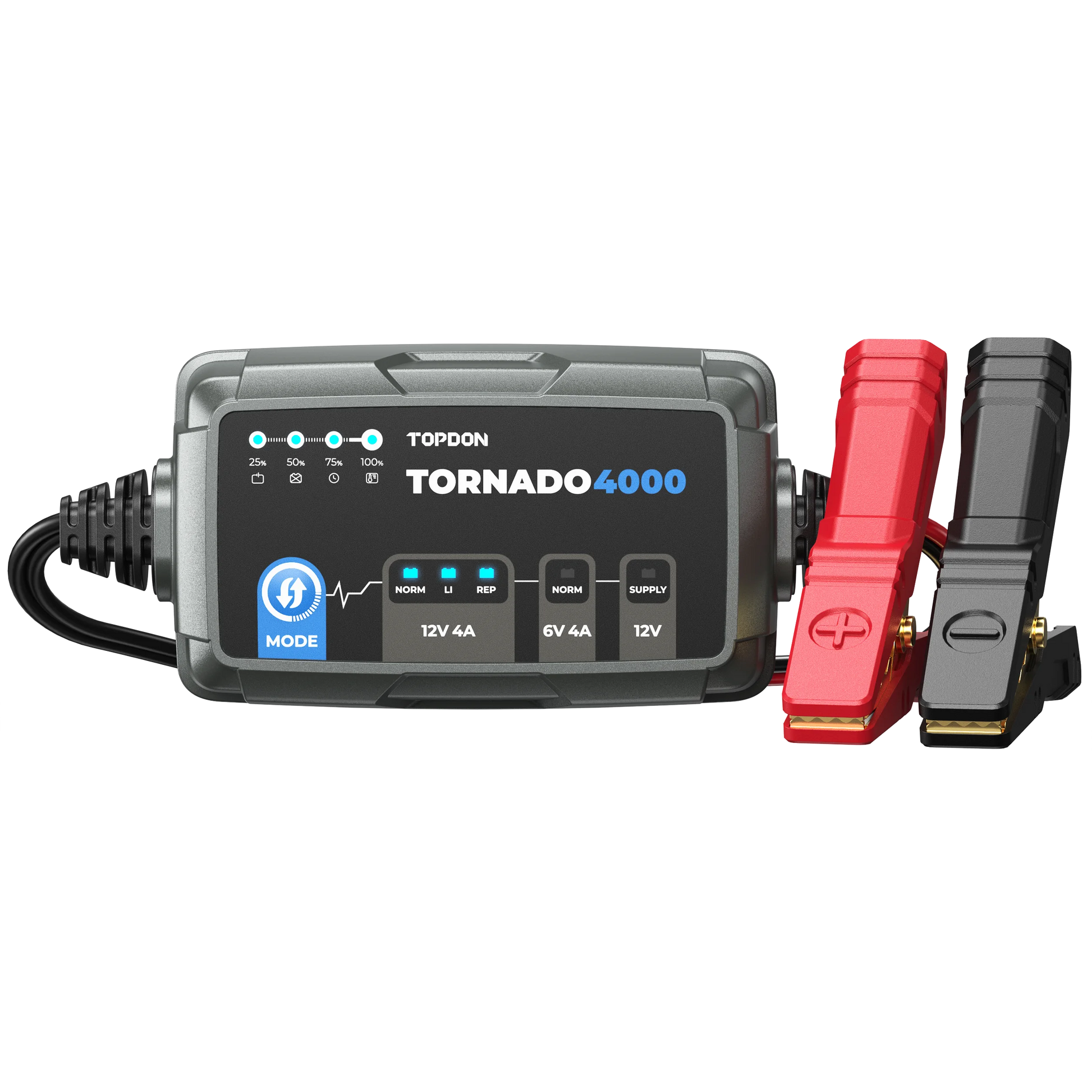 - TOPDONi patenteeritud 9-astmeline nutikas laadimine tagab teie pliiakule optimeeritud laadimisprotsessi. See mitte ainult ei lae akut vaid toimib ka aku hooldajana ning lagundab akus tekkivaid sulfaate, et aku eluiga pikendada. Lisaks pakub Tornado4000 liitiumakudele mõeldud nutikat laadimisrežiimi.